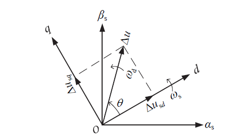 $\left\{ \begin{align} & \Delta {{u}_{\text{s}d}}=|\Delta u|\cos \theta \\ & \Delta {{u}_{\text{s}q}}=|\Delta u|\sin \theta \\ & \theta =|{{\omega }_{\text{d}}}-{{\omega }_{\text{s}}}|t+{{\theta }_{\text{0}}} \\ \end{align} \right.$ (4)