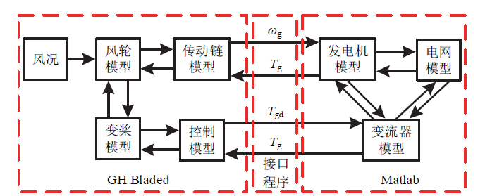 现有商业仿真软件很难同时满足计及载荷特性和电网特性的精细化建模(体现机电交互耦合特性)需求。GH Bladed软件是目前国内外整机制造商应用最广的商业化风机设计软件, 其优势在于整机建模仿真、载荷计算、振动分析等, 但要建立比较精细化的发电机、变流器、电网模型是比较困难的。Maltab软件是研究双馈风电机组的并网特性和电力系统仿真计算方面应用最广泛的仿真软件, 其优势在于发电机、变流器、电网模型等并网特性仿真研究, 但是在Matlab软件中构建风轮、塔架详细模型、载荷计算、振动分析等比较困难。因此, 计及载荷特性和电网特性的精细化模型需要采用联合仿真技术, 联合仿真模型结构如图4所示。