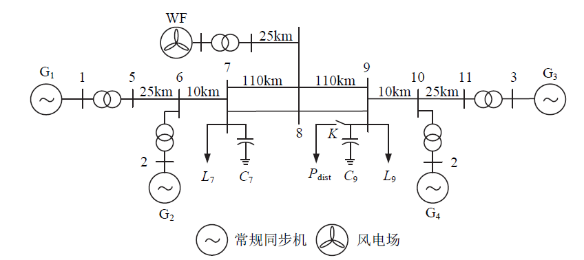 电力系统正常运行时, 并网点(point of common coupling, PCC)电压本身存在不同频率的振荡分量, 但幅值很小, 可以忽略。但是负荷投切、电源出力的变化等扰动会加剧并网点电压的振荡。本节以投入新负荷、风电场参与电力系统调频为例来分析并网点电压基波附近振荡分量的变化趋势。仿真模型的电气部分采用如图5所示含风电场的四机两区模型[23]。图中, G1~ G4表示常规同步机; L、C分别表示负荷等效电感、电容; WF表示风电场, 容量为300 MW; Pdist表示扰动负荷, 位于节点9, 容量为180 MW。
