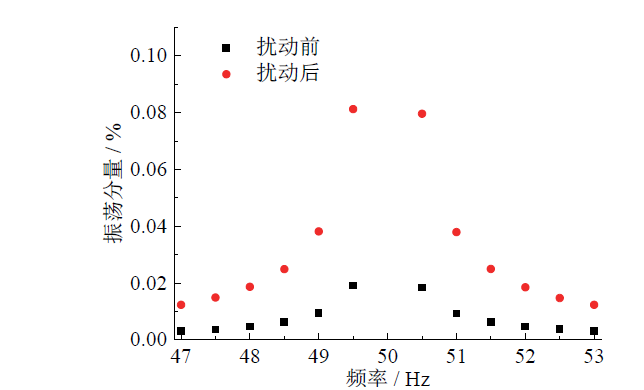仿真选取平均风速为14 m/s湍流风况, 对扰动负荷投入前后的并网点电压利用离散傅里叶变换进行频谱分析, 频谱分析结果如图6所示。扰动前后并网点电压振荡分量如表1所示。