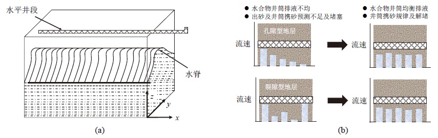 | 图1 (a)水平井开采的底水脊进示意图; (b)水平井开采水合物井筒均衡排液示意图[6]Fig. 1 (a) Diagram of bottom water ridge progression for horizontal well exploitation; (b) diagram of equalized fluid discharge from hydrate wellbore for horizontal well extraction[6] |