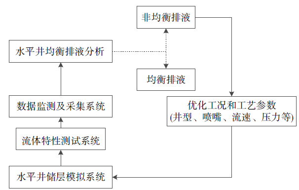 卢静生等[44, 45, 46]通过三维天然气水合物开采出砂及防砂装置, 开展了含水合物储层开采的水平井开采及出砂实验, 发现水合物储层的“ 分阶段分级出砂” 规律和“ 泥质粉砂储层失水造壁性” 。结合实验发现水合物储层水流对出砂的严重影响以及南海第二次试采存在的水平井排液不均问题, 提出并获得授权了中国发明专利“ 一种天然气水合物水平井均衡排液测试装置及方法” (图5)。通过均衡排液技术优化控水控砂工况和工艺参数设置(井型、喷嘴、流速、压力等)实现水合物在水平井的控流(水)控砂控冰堵, 进一步实现出砂/防砂/井筒携砂/流动保障/碳封存等为一体的固相控制策略[47]。