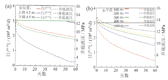 | 图4 中国第二次水平井试采不同工况水平段产能模拟[5]:(a)不同垂向位置穿越试采矿体日产气量与井底流压关系预测图; (b)不同长度水平段日产气量与井底流压关系预测图Fig. 4 Production simulation of horizontal well under different conditions[5]: (a) effect of gas production on bottom-hole pressure with different vertical positions of horizontal segment through the target sediment; (b) effect of gas production on bottom-hole pressure with different horizontal segment lengths |