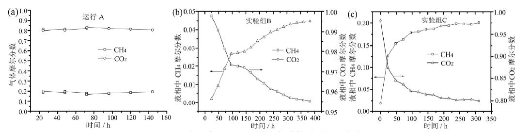 YUAN等[30]认为限制置换率的控制步骤为CH4分子从水合物表面向气相扩散和CO2分子从气相向深层水合物含水层扩散, 然而先前关于CO2乳状液置换的研究并不侧重于通过改进控制步骤来提高置换率。因此, YUAN以十二烷基硫酸钠(sodium dodecylsulfate, SDS)和聚氧乙烯山梨醇单油酸酯(Tween 80)为乳化剂(Tween 80可使乳液更加亲水并降低乳液的抗流动性, SDS使新形成的水合物颗粒层更疏松), 制备一种新型的C/W乳液, 并在三维反应器中评估了该CO2乳状液在多孔介质中从水合物中置换CH4的效果。结果表明, 添加适当浓度的SDS有利于C/W乳液的稳定; 随着Na2SO4浓度的增加, CO2乳液的稳定时间缩短。高搅拌速率、低温和高压有利于CO2乳液稳定性。为研究CO2乳液置换甲烷水合物的性能, YUAN等[30]进行了3组实验, 由图6反应器中CH4和CO2摩尔分数随时间的变化可知, 在实验组A中, 水合物储层温度为281.2 K(CO2水合物稳定区, CH4水合物不稳定区), 乳液温度为293.2 K, 随着置换反应进行, CO2和CH4的摩尔分数变化微小, 表明CO2乳状液置换法不适用于条件接近平衡曲线的水合物储层; 在实验组B置换过程中, 水合物储层温度为275.7 K(CO2、CH4水合物稳定区), 乳液温度为290.2 K, 反应器中CH4的摩尔分数增加, CO2的摩尔分数减少, 表明置换过程有效进行。实验组C在实验组B的基础上额外添加了质量浓度为3.35%的Na2SO4, 结果显示CH4和CO2的摩尔分数发生变化的时间早于实验组B, 且CH4的质量分数更高, 表明实验组C的置换效果优于实验组B的置换效果。这与ZHOU等[29]的结论不一致。ZHOU等指出在液态CO2置换CH4水合物的情况下, 与CO2、CH4水合物均稳定存在区相比, CO2水合物稳定区、CH4水合物不稳定区的置换率更大。
