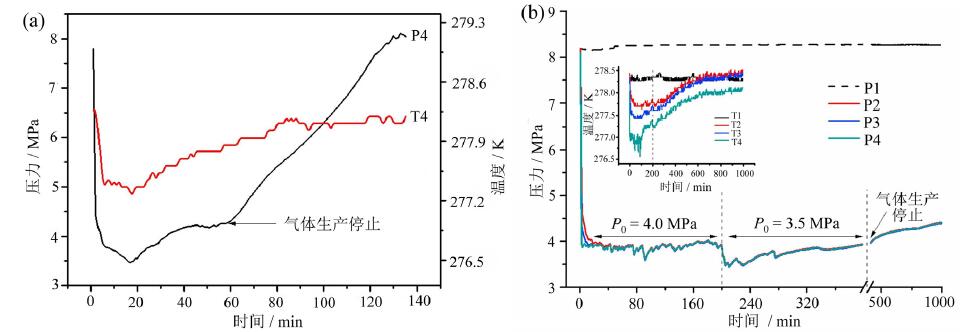![]() | 图7 减压过程中的温度和压力变化:(a)无CO2水合物水合盖层; (b)有CO2水合物盖层[31]Fig. 7 Temperature and pressure changes during decompression: (a) CO2 free hydrate cap; (b) CO2 hydrate cap[31] |