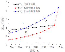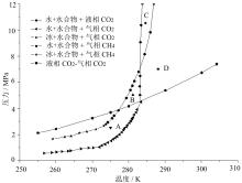 CO2置换开采水合物是利用CO2水合物和CH4水合物之间的相平衡差, 将水合物中的CH4开采出来, 同时封存CO2, 该方法在热力学和动力学上均证明是可行的[21]。如图1所示[22], 在A区与B区, CO2水合物可以稳定存在, 而CH4水合物不稳定, 该区域可用CO2去替换CH4。研究表明, CO2水合物形成释放的能量为57.98 kJ/mol, CH4水合物分解吸收的能量为54.49 kJ/mol, 这种转换反应的吉布斯自由能为负值, 为自发过程[23]。OHGAKI等[20]研究了CO2-CH4混合水合物体系气相、液相和水合物相中压力和温度的等温相平衡关系, 发现CH4在气相和水合物相的平均分配系数约为2.5, 即水合物相中的CH4被CO2选择性地取代, 首次证明了CO2分离联合甲烷开采的可能性。