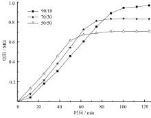 在区域A中, ZHOU等[29]使用三组不同CO2和水质量比(C/W)的乳液从石英砂水合物中置换CH4, 在285.2 K、50 MPa时, 通过比较不同CO2含量下电阻与乳化时间的关系发现(图4), C/W为90∶ 10、70∶ 30、50∶ 50时系统电阻达到稳定所需时间分别为90 min、70 min、50 min。随后, 通过测定乳液的电阻与静止时间的关系发现, C/W为90∶ 10、70∶ 30、50∶ 50时体系稳定时间分别为7 h、10 h、12 h, 表明CO2含量少更容易形成乳液并且能更稳定地存在。由图5可知, 用90∶ 10乳状液置换的效果最好, 这与PHALE等[27]通过模拟得出的CO2乳液浓度越高置换CH4越少的结论相反。