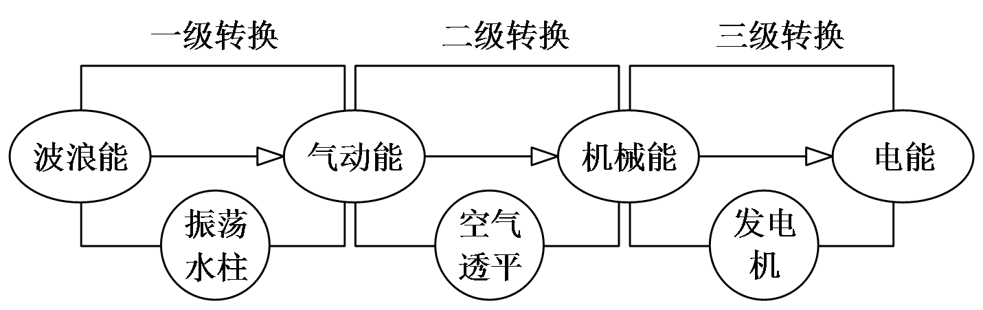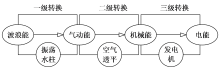 OWC波浪能转换装置属于气动式波浪能转换装置, 其工作原理是海水在气室里上下往复运动来压缩和膨胀气室内空气使其与外部大气产生压力差, 从而迫使气室内的气体通过与外界大气相接管道流出或流入, 管道中空气透平被空气推动旋转带动发电机发电。波浪能从捕获到发电需要经过三级能量转换:一级转换为波浪能被捕能装置捕获, 二级转换为将捕能装置捕获的能量通过能量转换装置转换成发电机所需的能量形式(机械能), 三级转换为通过发电机等发电设备将能量以电能形式输出[2]。振荡水柱能级转换如图1所示。