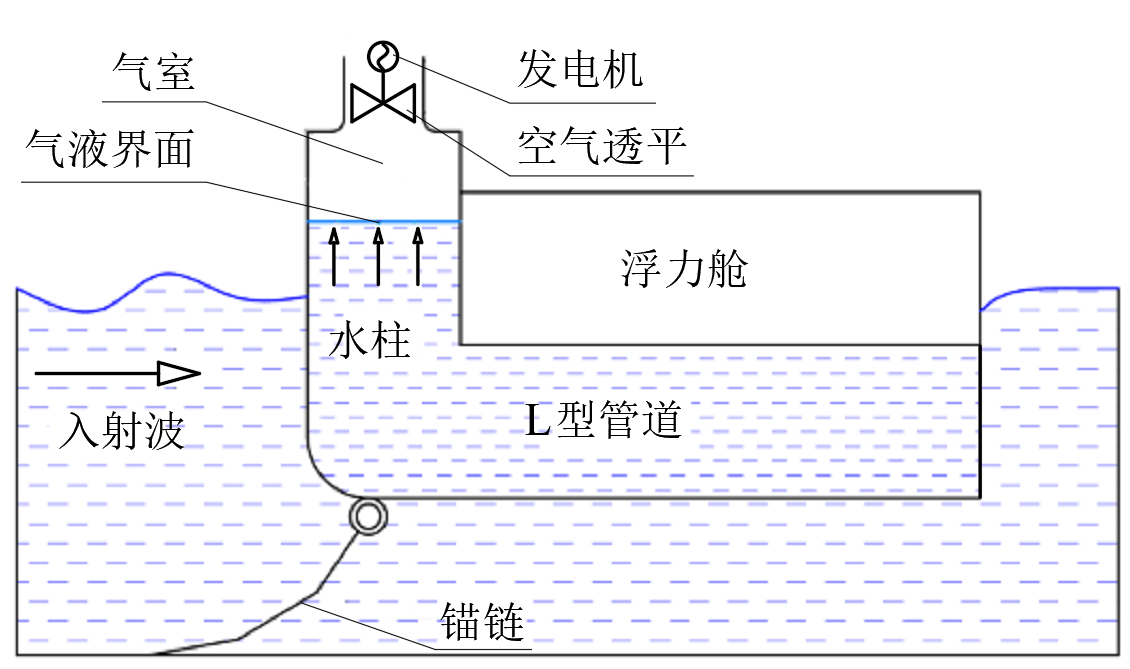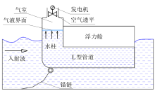 振荡型OWC可位于远海海域, 整个浮体参与波浪能的俘获, 属于振荡单浮体也可归为振荡浮子技术, 浮体随着波浪运动, 其气室内的水柱由于受波浪影响小以及受到惯性的作用, 导致水柱与浮体产生相对运动从而将波浪能转换成气室内气体的气动能, 接着通过能量摄取(power take-off, PTO)系统将气体的动能转换成电能[21, 22]。