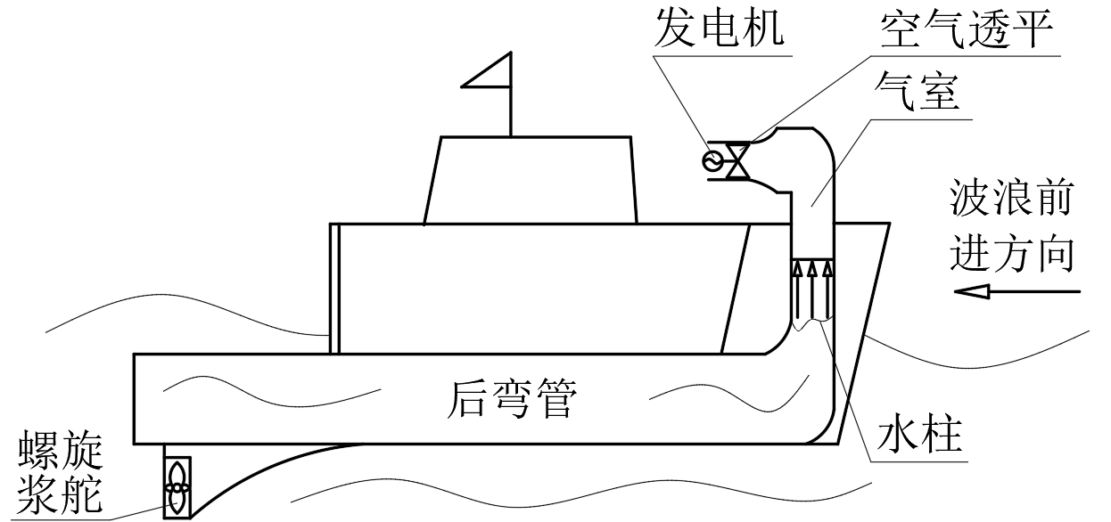 在1987年益田善雄提出后弯管技术之前, 研究人员先设计了管道开口面朝入射波的装置, 但是在测试实验模型时, 发现前弯管的转换效率并不理想, 后来发现后弯管的设计能获得更好的性能[23]。后弯管由一个L形导管、一个浮力室、一个气室和一个PTO系统组成(图6)[24], 海水淹没下方的管道, 管道开口背向入射波。后弯管装置的纵荡、垂荡和纵摇运动以及水柱相对运动形成多自由度共振响应, 扩大了有效转换的波周期范围[25], 使得后弯管在较宽的周期范围内具有高捕获宽度比(capture width ratio, CWR)。WU等[26]设计测试的BBDB波浪动力船利用单一结构的纵荡、垂荡和纵摇运动来捕获波浪能, 具有很高的CWR和很高的材料利用率, 在同等规模下, BBDB波浪动力船的建造费用约为“ 巨鲸” 号的三分之一(图7)。