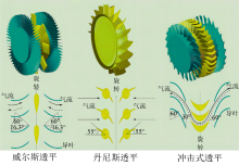 OWC装置的传动主角为空气透平。在OWC装置早期(益田善雄发明航标灯时期)使用的是传统的单向空气透平, OWC装置上必须配备单向阀的整流系统。但是在后来的OWC大型机械中, 传统单向透平的工作效率并不理想, “ 海明” 号上的单向空气透平工作效率就证明了这一缺点。随后发明的自整流空气透平就被用于适配OWC装置的能量转换系统, 目前提出和测试的大多数带有自整流结构的空气透平分为威尔斯透平、丹尼斯透平和冲击式透平三种类型[30](图9)。