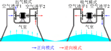 RODRÍ GUEZ等[36]研究发现, OWC装置配备双单向透平(图10)可以成为替代自整流透平的可靠且具有竞争力的方案。两个单向透平组装在同一旋转轴上。在这种布置中, 两个透平根据大气和OWC气室之间的压差交替发挥作用:第一种情况(出气模式)是空气透平1在气室排出空气时转换能量, 此时空气透平2起止回阀的作用, 防止空气逆流; 第二种情况(吸气模式)是空气透平2在气室吸入空气时被驱动, 此时空气透平1起防止空气逆流的作用。双单向透平可以减少空气流入时的负扭矩影响, 并且在特定情况下优化了转子叶片后提高的效率甚至高于自整流透平。