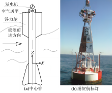 中心管最早出现在1885年的吹气式航标灯上, 如图8(a)所示。1947年日本人益田善雄发明了第一个基于中心管OWC原理的导航航标灯。图8(b)即为当时基于OWC原理生产的浦贺航标灯。其成本和稳定性都达到了商用标准, 该设备还设有自我保护装置和充放电池, 当产出的电能超过使用量时就被储存在电池内以备不时之需。虽然这些装置额定功率只有60 W, 只能满足一只航标灯的用电需求, 但其为最早实现商品化的波浪发电装置[27]。中心管装置相较于其他OWC装置具有独特的性质, 即轴对称性和结构简单。这使得装置在工作时对于波的方向不敏感, 可转换任意方向的波浪能[28]。中心管OWC是众多OWC装置中进行深入开发风险最低、最经济的选择[27]。我国在1992年设计建造的中水道1号灯船波力发电装置采用前开口直管和后弯管两种振荡水柱波浪能转换系统, 经过水池模型试验后, 在琼州海峡中水道1号标位成功进行了海上试验, 实测装置的输出功率超出了额定功率, 运行良好[29]。