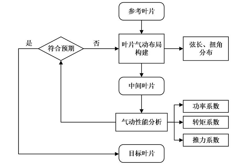 叶片部分的拟合变量较多, 拟合变量与目标、约束之间呈非线性关系。如果人为对中间变量进行修改, 经验成分较大且效率较低。因此借助迭代法驱动设计变量以寻找最相近的结果, 具体设计流程如图3所示。整个过程包括参考叶片的选择, 相似目标、约束的设定; 迭代算法驱动构建变量改变, 修改风电机组叶片气动布局; 对风电机组气动性能进行预测; 判断气动特征是否符合预期。