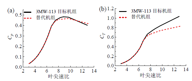图4(a)为3MW-113型目标机组与替代机组风能利用系数 ${{C}_{P}} $的对比情况。在低叶尖速比时, 风机工作处于额定风速以上, 风机为保持功率不变进行变桨动作, 保持风机功率恒定, 此时风机气动性能主要受控制系统的影响。因此在低叶尖速比下, 替代机组与目标机组 ${{C}_{P}} $较为相近。而在高叶尖速比时, 风机处于额定风速以下的工作状态, 风机气动性能依靠风机叶片气动外形。因此在这部分, 替代机组与目标机组的 ${{C}_{P}} $有一定的偏差, 但最大偏差不超过5%, 处于可接受范围之内。