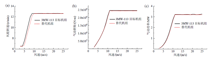 (2)采用提出的方法对甘肃某风电场3MW-113型风电机组进行相似构建工作, 构建的替代机组与3MW-113目标机组相比, 在风能利用系数 ${{C}_{P}} $、气动转矩、气动功率方面偏差均很小。证明提出的相似构建方法的可行性。