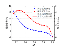 式中:x为参考点与叶根距离; 多项式系数 ${{A}_{n}} $、 ${{B}_{n}} $分别作为弦长和扭角的构建控制变量; c和θ 为每个参考点x上的弦长和扭角。图2为由6个多项式系数控制的扭角、弦长布局效果。