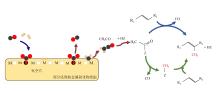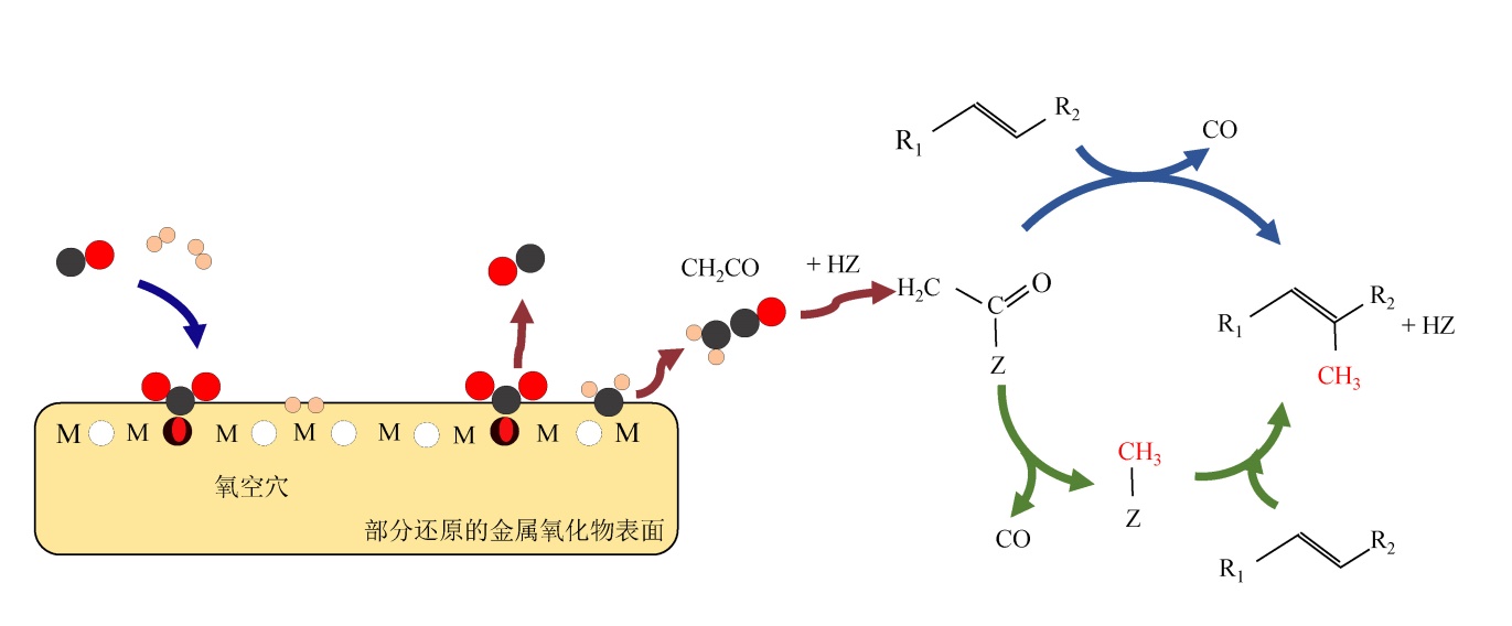 2016年JIAO等[10]提出了一种由金属氧化物和分子筛组成的双功能催化体系(oxide-zeolite, OX-ZEO)。在复合催化剂中, 共活化和C-C偶联反应分别在还原的尖晶石氧化锌表面和沸石孔中进行。该催化剂在400 ℃、1.5 MPa、H2/CO = 1.5的反应条件下, CO转化率为17%时, 低碳烯烃选择性达到80%。C2 ~ C4烯烃选择性明显高于改性的铁基催化剂制烯烃的选择性, 打破了ASF分布的限制。随后, CHENG等[11]报道了另一种ZnZrOx/SAPO-34复合催化剂, 反应机理如图2所示。在CO约10%的转化率下, 对C2 ~ C4烯烃的选择性达到了70%, 同样打破了ASF分布的限制。这两项研究为合成气高选择性转化制备轻质烯烃开辟了新的途径。与SAPO-34结合的Zn基氧化物也逐渐被应用在该领域。