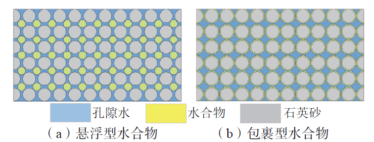 对于含水合物多孔介质混合物, 水合物饱和度、水合物微观赋存模式、骨架颗粒性质等直接影响混合物的电学特性[21, 22, 46, 47, 48, 49, 50]。本文针对典型的水合物赋存模式, 建立了含孔隙悬浮型和颗粒包裹型水合物多孔介质的模型几何结构(图3)。