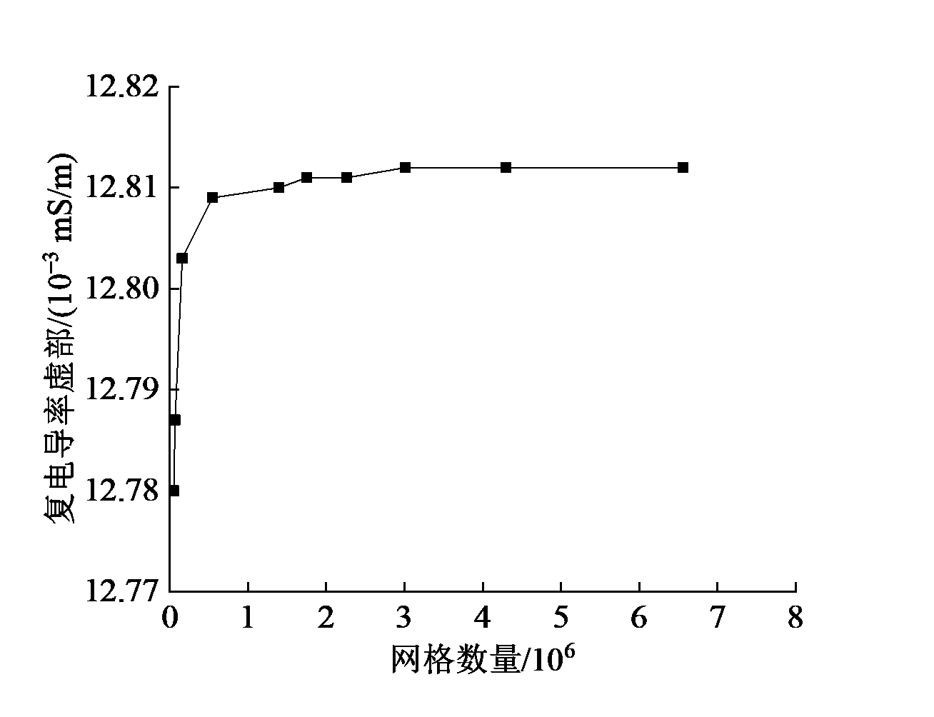 分析图4可知, 随着网格数量的增加, 多孔介质复电导率虚部呈现先增大后趋于平稳的趋势。当网格数量在2 × 106以上时, 多孔介质复电导率虚部开始随网格数量的增加而趋于稳定。综合考虑模型解的准确性和耗费的算力资源, 选定网格的最大和最小单元的尺寸分别为0.70 μ m和1.56 × 10-2 μ m, 单元数量为2 262 485。