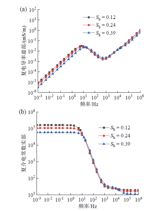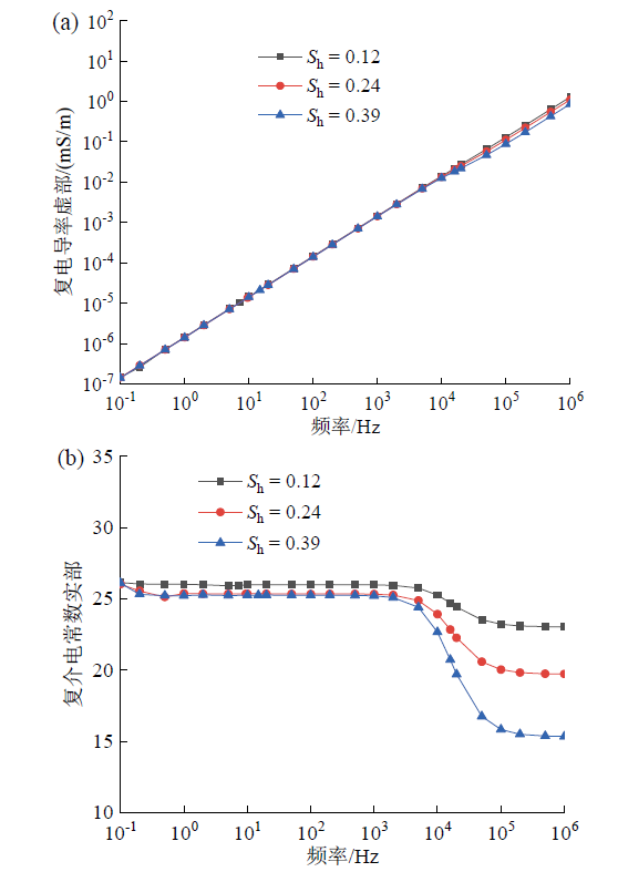 图5显示, 在含悬浮型水合物多孔介质中, 骨架颗粒与孔隙水接触而在表面形成双电层, 在双电层极化主导的频段范围内(图中10 Hz), 当频率低于峰值频率时, 随着水合物饱和度的增加, 石英砂颗粒表面复电导率虚部减小, 导致多孔介质复电导率虚部减小、复介电常数实部减小; 当频率高于峰值频率时, 双电层极化作用逐渐减弱, 复介电常数实部随着频率的升高逐渐减小; 当频率高于水合物频散频率(模型中设定为1.59 × 104 Hz)时, 水合物的介电常数随频率急剧减小, 导致多孔介质复介电常数的实部随着频率的升高而逐渐减小, 在该频率范围内水合物的介电常数远小于水的介电常数, 使得多孔介质复介电常数实部随水合物饱和度的增大而显著减小。