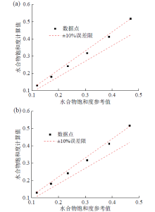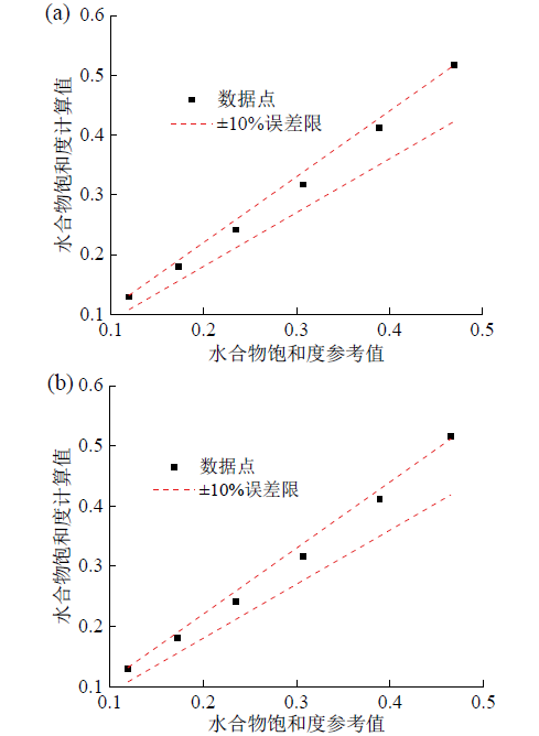 | 图7 悬浮型水合物饱和度的模型计算值与参考值的比较Fig. 7 Comparison between model predicted and reference hydrate saturations for suspending hydrates |