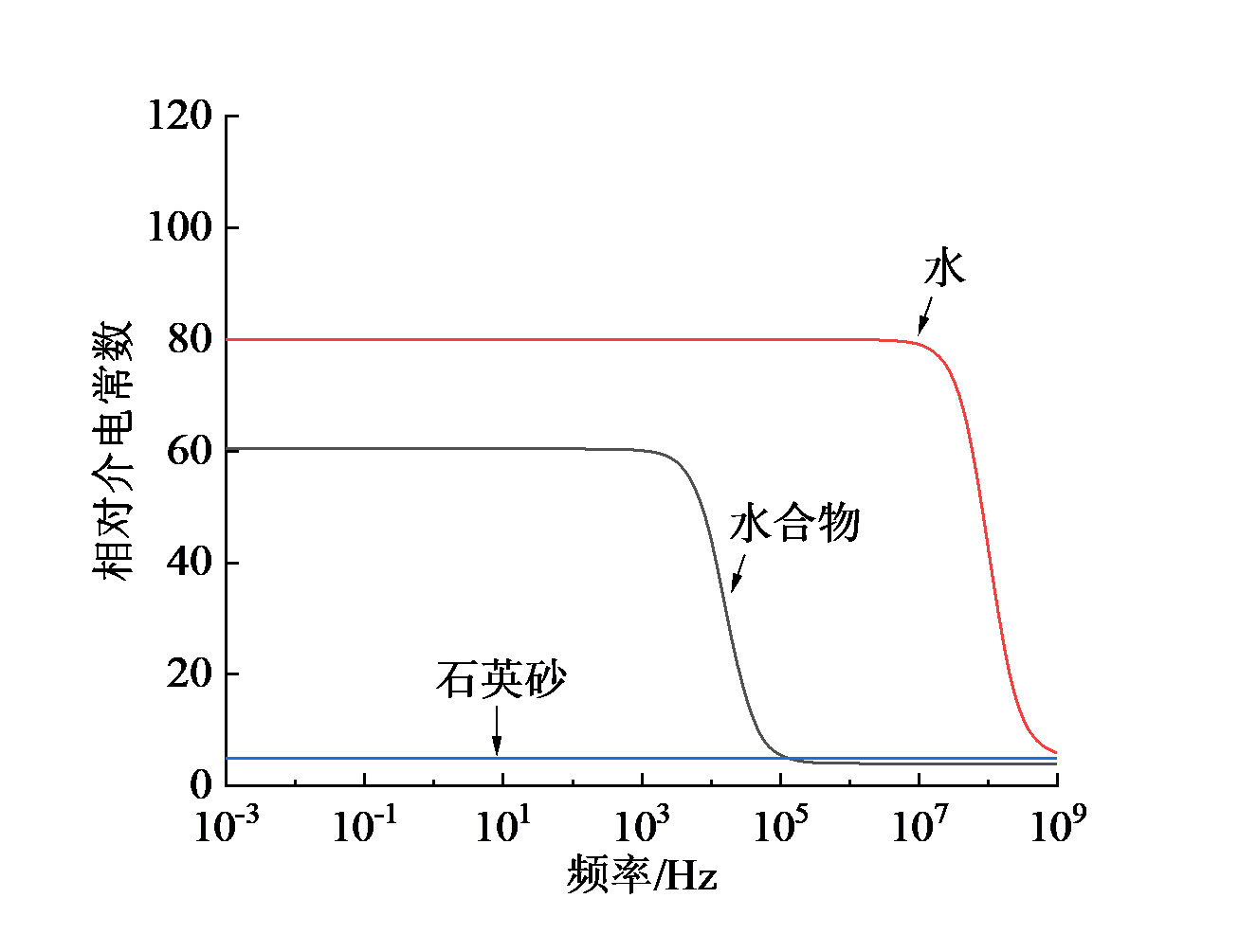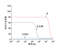 图2展示了水合物、水、石英砂在宽频范围内的相对介电常数频谱。由图可见, 水合物的介电常数在kHz~MHz频段呈现出频散特性, 在低于1 kHz范围内相对介电常数大于60, 而高于10 MHz则小于5[18, 20]。水合物极化峰值频率(图中曲线斜率最大处所对应的频率点)受到多种因素的影响, 如水合物客体分子类型、环境温度、压力等。