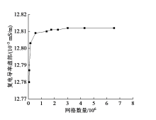 | 图4 水饱和多孔介质复电导率虚部随网格数量的变化曲线Fig. 4 Variation curves of the imaginary part of complex conductivity of water saturated porous medium with the number of mesh cells |