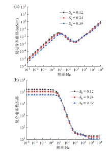 图6显示, 在含包裹型水合物多孔介质中, 水合物将骨架颗粒与孔隙水隔离, 因此含包裹型水合物多孔介质在低频段(< kHz)的电频谱不受双电层极化的影响, 多孔介质复电导率虚部、复介电常数实部的频散特性不显著; 当频率高于水合物频散频率时, 随着水合物饱和度的增大, 孔隙水的饱和度降低, 由于水合物的介电常数远小于水的介电常数, 则多孔介质复电导率虚部和复介电常数实部显著减小。
