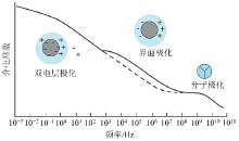 交变电场作用下饱和水多孔介质呈现出多种电极化现象(图1)。在低频段(< kHz), 主导的极化机制为薄膜极化和双电层极化; 在中频段(kHz~MHz), 界面极化(Maxwell-Wagner效应)起主导作用; 在高频段(> GHz)则以水分子转向极化为主导[35, 36]。